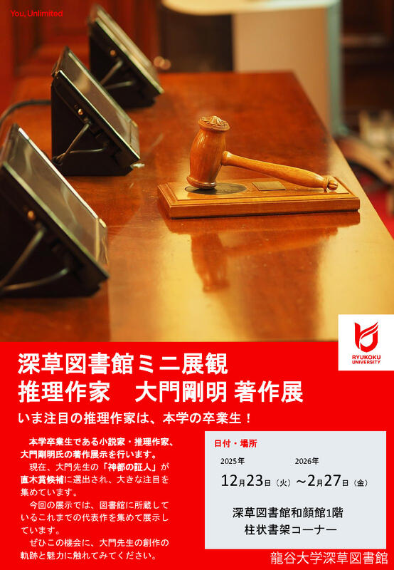 本学卒業生である小説家・推理作家、大門剛明氏の著作展示を行います。現在、大門先生の「神都の証人」が直木賞候補に選出され、大きな注目を集めています。今回の展示では、図書館に所蔵しているこれまでの代表作を集めて展示しています。ぜひこの機会に、大門先生の創作の軌跡と魅力に触れてみてください。