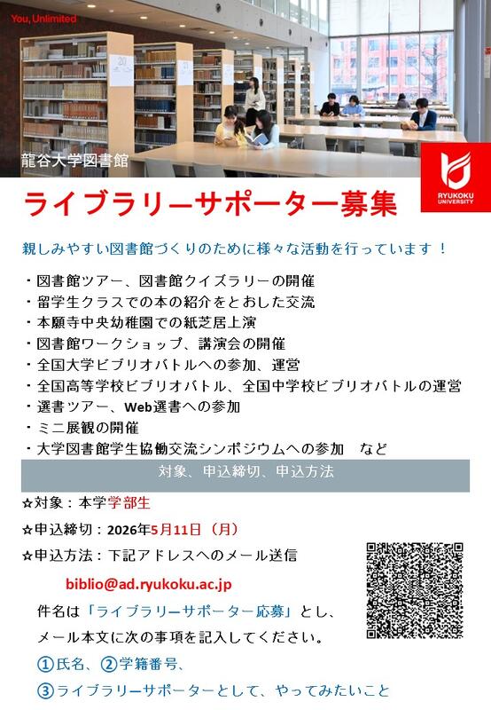 龍谷大学図書館では、学部生の皆さんを対象として、ライブラリーサポーターを募集します。