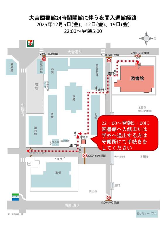 夜間の入退館経路は大宮図書館木戸門(北小路通側)から大宮学舎北門、守衛所(正門すぐ)の動線(以下の図参照)とし、大宮学舎守衛所で22:00から翌朝5:00まで入構管理を実施。
