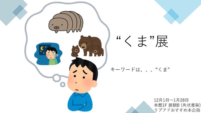 今回の展観は”くま”展と題しまして、日常の"くま"にまつわる本を集めました。最近、ニュースで度々その名を耳にするようになった生物”くま”。その脅威は北海道や東方地方を中心に拡大しており、自衛隊が派遣されるほどに事態は深刻化しています。さらに、瀬田キャンパスが位置する滋賀県でも目撃されており、その足音がいつ聞こえてもおかしくない状況です。全国で影響が出ているクマ被害から”くま”について知るきっかけにしてください。