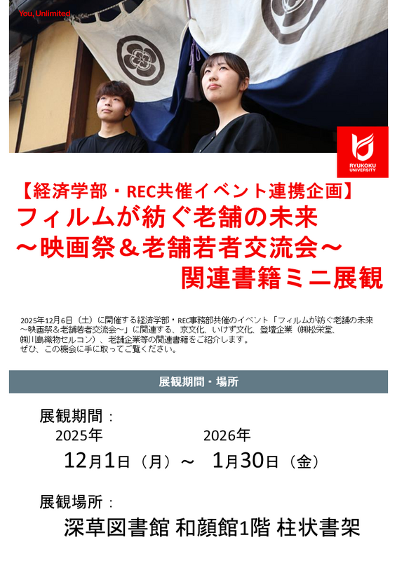 経済学部・REC事務部共催のイベント「フィルムが紡ぐ老舗の未来~映画祭&老舗若者交流会~」(2025年12月6日開催)に関連する、京文化、いけず文化、登壇企業(㈱松栄堂、㈱川島織物セルコン)、老舗企業等の老舗企業等の関連書籍をご紹介します。